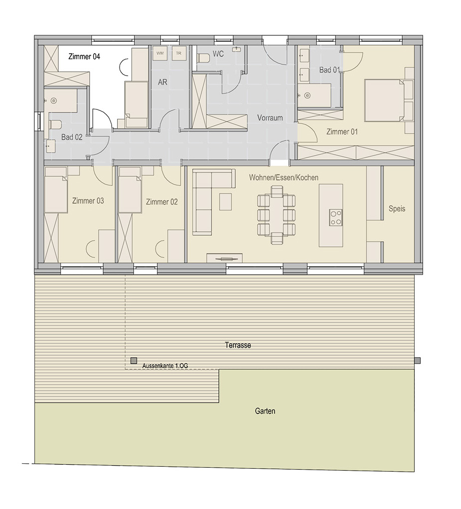 Diese 134,45 m² Wohnung bietet eine moderne Raumaufteilung mit offenem Wohn-/Essbereich und einem gemütlichen Schlafzimmer. Eine 75m² große Terrasse erweitert den Wohnraum und schafft eine angenehme Atmosphäre im Freien.